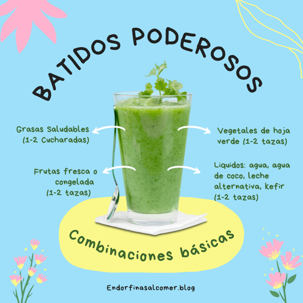 Además de lavar bien los vegetales y frutas, es importante incorporar buenos aliados como fuentes de Omega-3, proteína, fibra, probióticos, prebióticos y superalimentos en polvo. Conocer los beneficios de los ingredientes nos ayuda a escoger mejor y aprovecharlos al máximo. Abajo compartimos algunas pautas básicas y proporciones que nos han ayudado mucho a crear jugos deliciosos, así como la receta que generalmente preparamos cada mañana. Lo mejor de hacer batidos es que no hay una receta única, hay miles de combinaciones posibles para usar nuestra creatividad todos los días.